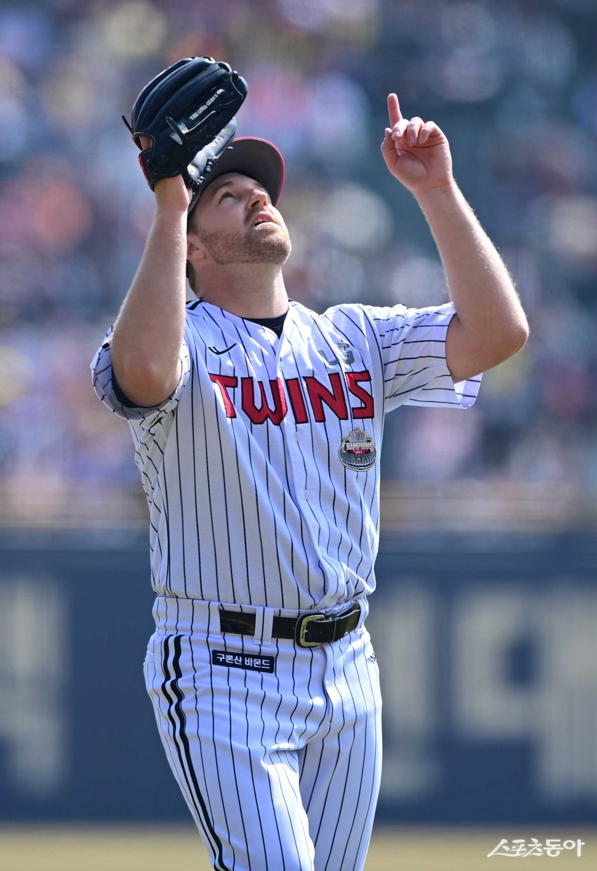 23일 서울 잠실야구장에서 열린 ‘2024 신한 SOL 뱅크 KBO리그’ LG 트윈스와 한화 이글스의 경기에서 1회초 수비를 마친 LG 선발투수 엔스가 기뻐하고 있다.