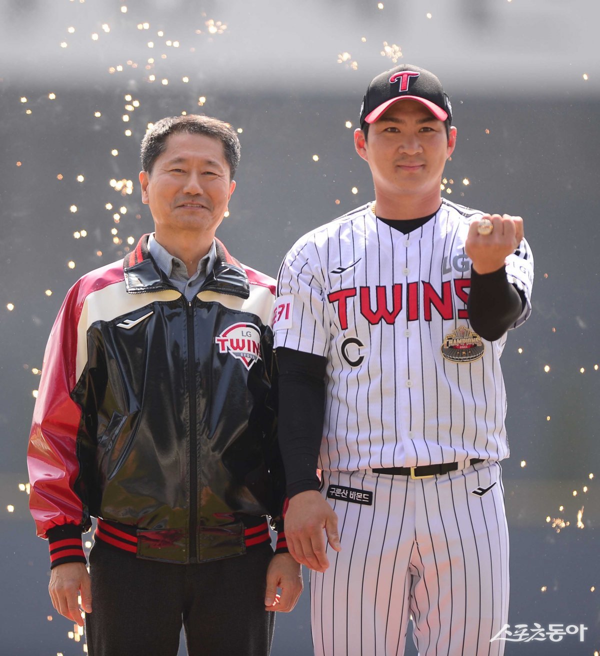 23일 서울 잠실야구장에서 열린 ‘2024 신한 SOL 뱅크 KBO리그’ LG 트윈스와 한화 이글스의 경기에 앞서 LG 오지환이 김인석 대표로부터 우승 반지를 받아 기념 촬영을 하고 있다.