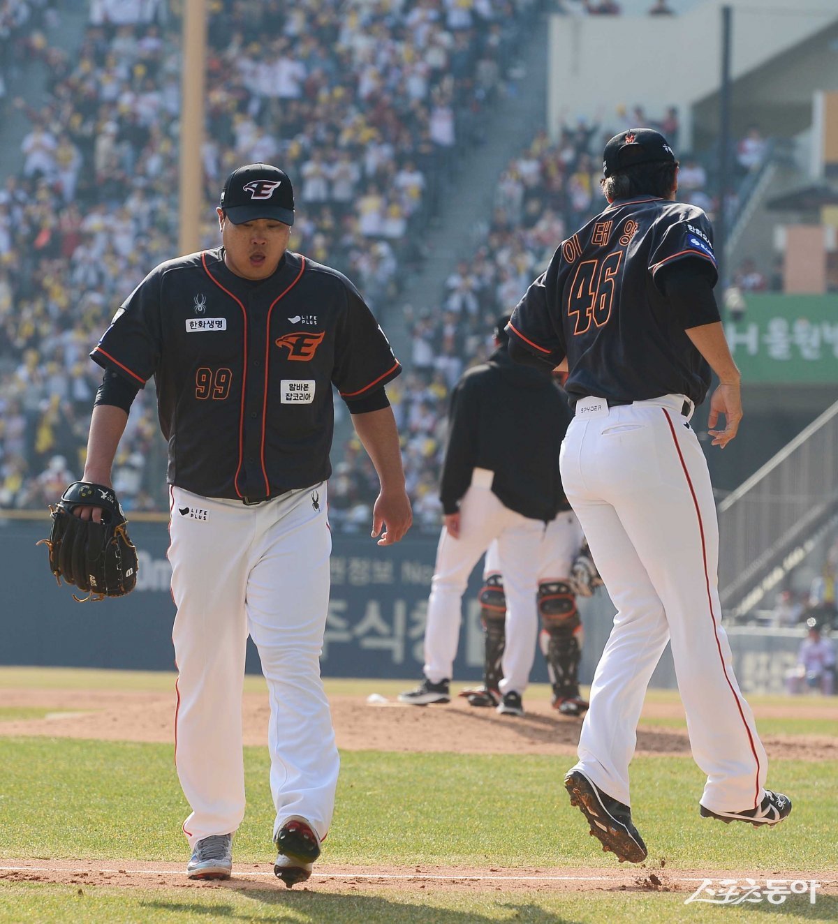 23일 서울 잠실야구장에서 열린 ‘2024 신한 SOL 뱅크 KBO리그’ LG 트윈스와 한화 이글스의 경기에서 4회말 2사 1, 2루 한화 류현진이 마운드를 내려가고 있다.