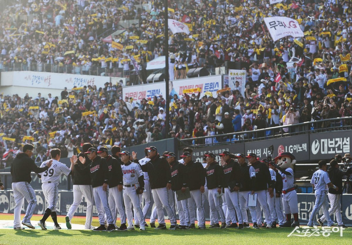 23일 서울 잠실야구장에서 열린 ‘2024 신한 SOL 뱅크 KBO리그’ LG 트윈스와 한화 이글스의 경기에서 8-2로 승리한 LG 선수들이 기쁨을 나누고 있다.