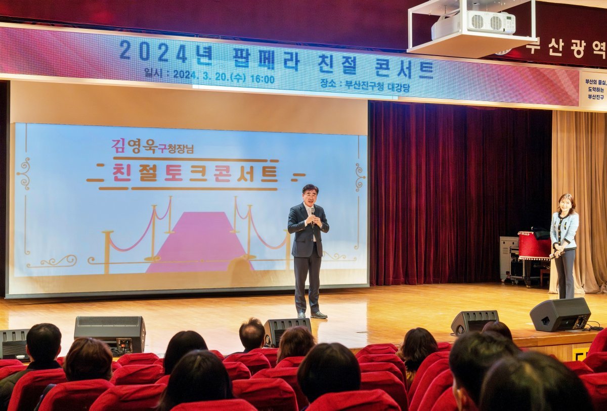 부산 부산진구(구청장 김영욱)가 지난 20일 구청 대강당에서 직원 250여명이 참여한 가운데‘2024년 팝페라 친절콘서트’를 개최했다고 밝혔다.이날 교육은 친절에 대한 새로운 트렌드 변화를 제시하고 특이민원 대응방법을 전달하기 위해 마련됐다. 여기에다 현실적인 친절 방안을 공유하고 강연 중간중간 몰입도를 높여주는 팝페라 공연이 더해져 직원들의 큰 호응을 얻었다.