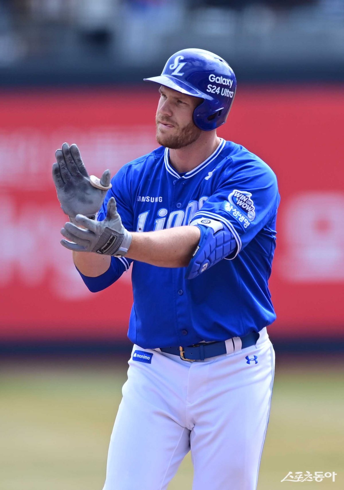 24일 경기도 수원KT위즈파크에서 열린 ‘2024 신한 SOL 뱅크 KBO리그’ KT 위즈와 삼성 라이온즈의 경기에서 1회초 1사 2, 3루 삼성 맥키넌이 선제 1타점 좌전 적시타를 친 후 기뻐하고 있다.