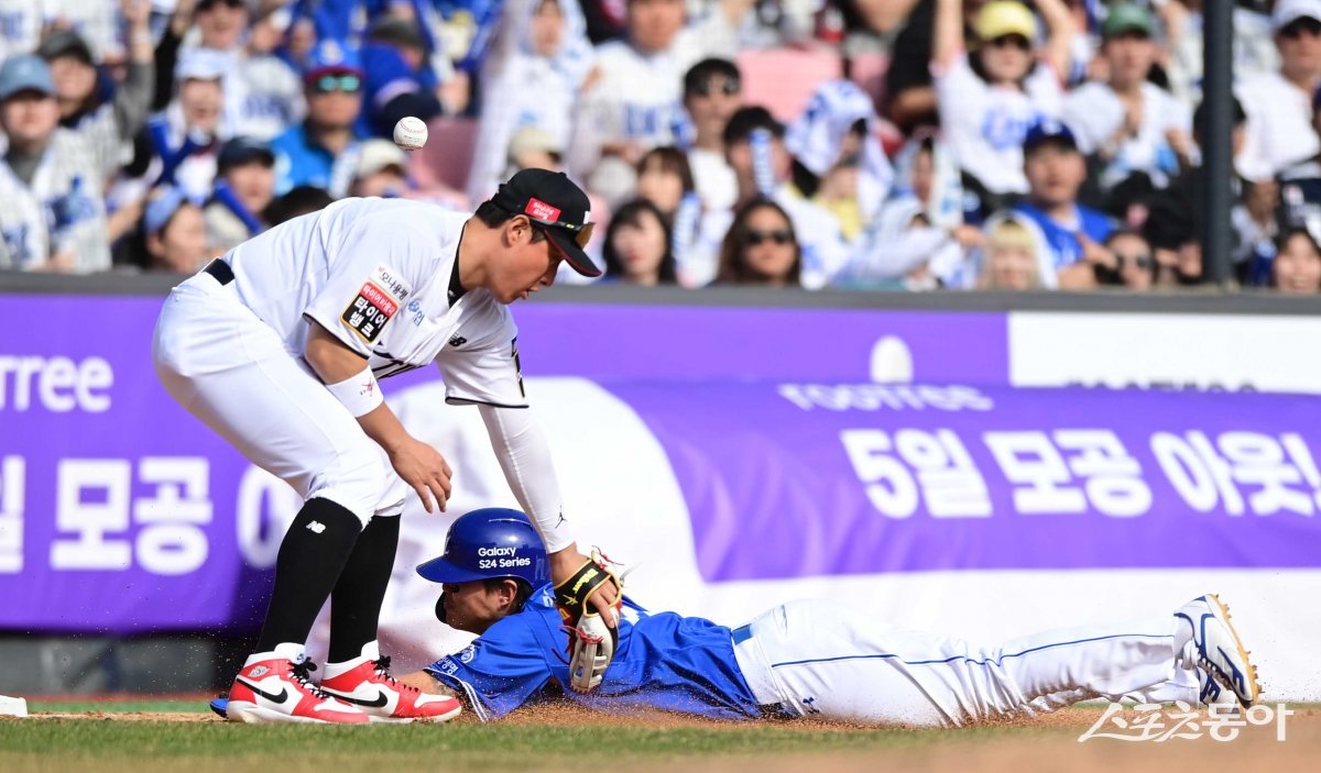24일 경기도 수원KT위즈파크에서 열린 ‘2024 신한 SOL 뱅크 KBO리그’ KT 위즈와 삼성 라이온즈의 경기에서 5회초 2사 1루 삼성의 안타 때 KT 좌익수의 실책을 틈타 1루주자 류지혁이 3루로 파고들어 세이프 되고 있다.