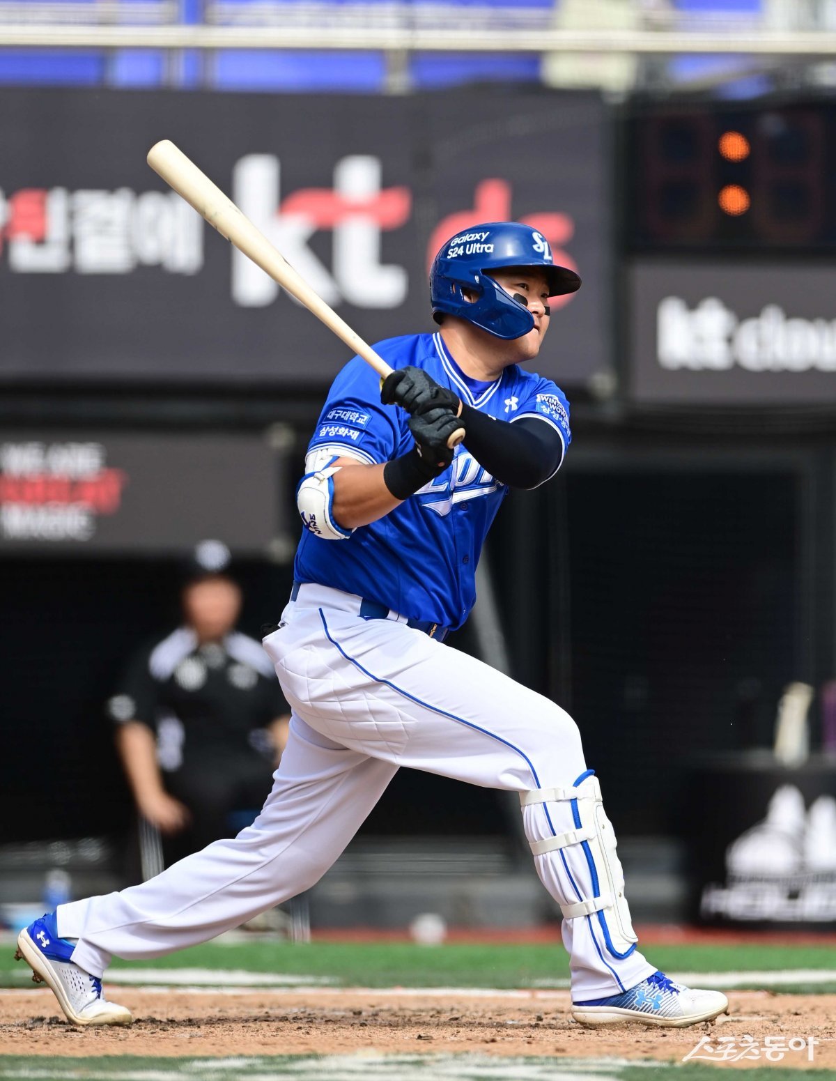 24일 경기도 수원KT위즈파크에서 열린 ‘2024 신한 SOL 뱅크 KBO리그’ KT 위즈와 삼성 라이온즈의 경기에서 3회초 1사 삼성 오재일이 우전 2루타를 치고 있다.