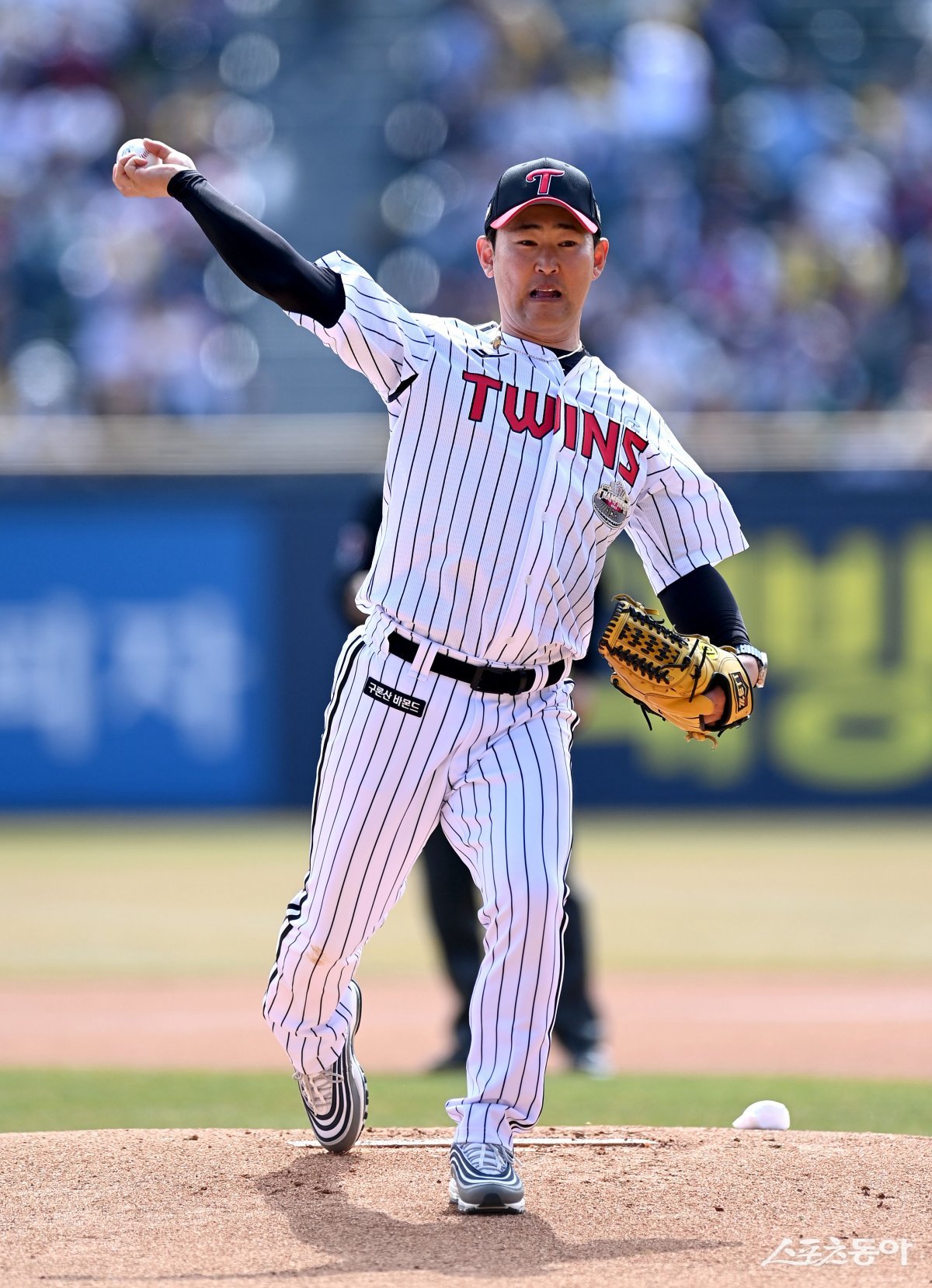 24일 서울 잠실야구장에서 ‘2024 신한은행 SOL뱅크 KBO리그’ 한화 이글스와 LG 트윈스 경기가 열렸다. 경기 전 LG 정주현이 은퇴식을 마친 후 시구를 하고 있다 .