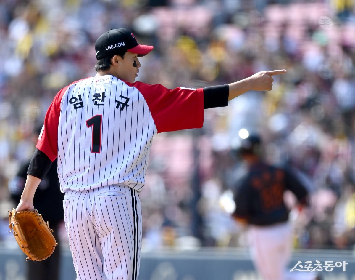 24일 서울 잠실야구장에서 ‘2024 신한은행 SOL뱅크 KBO리그’ 한화 이글스와 LG 트윈스 경기가 열렸다. 선발 투수로 등판한 LG 임찬규가 2회초 병살타를 잡은 후 기뻐하고 있다.