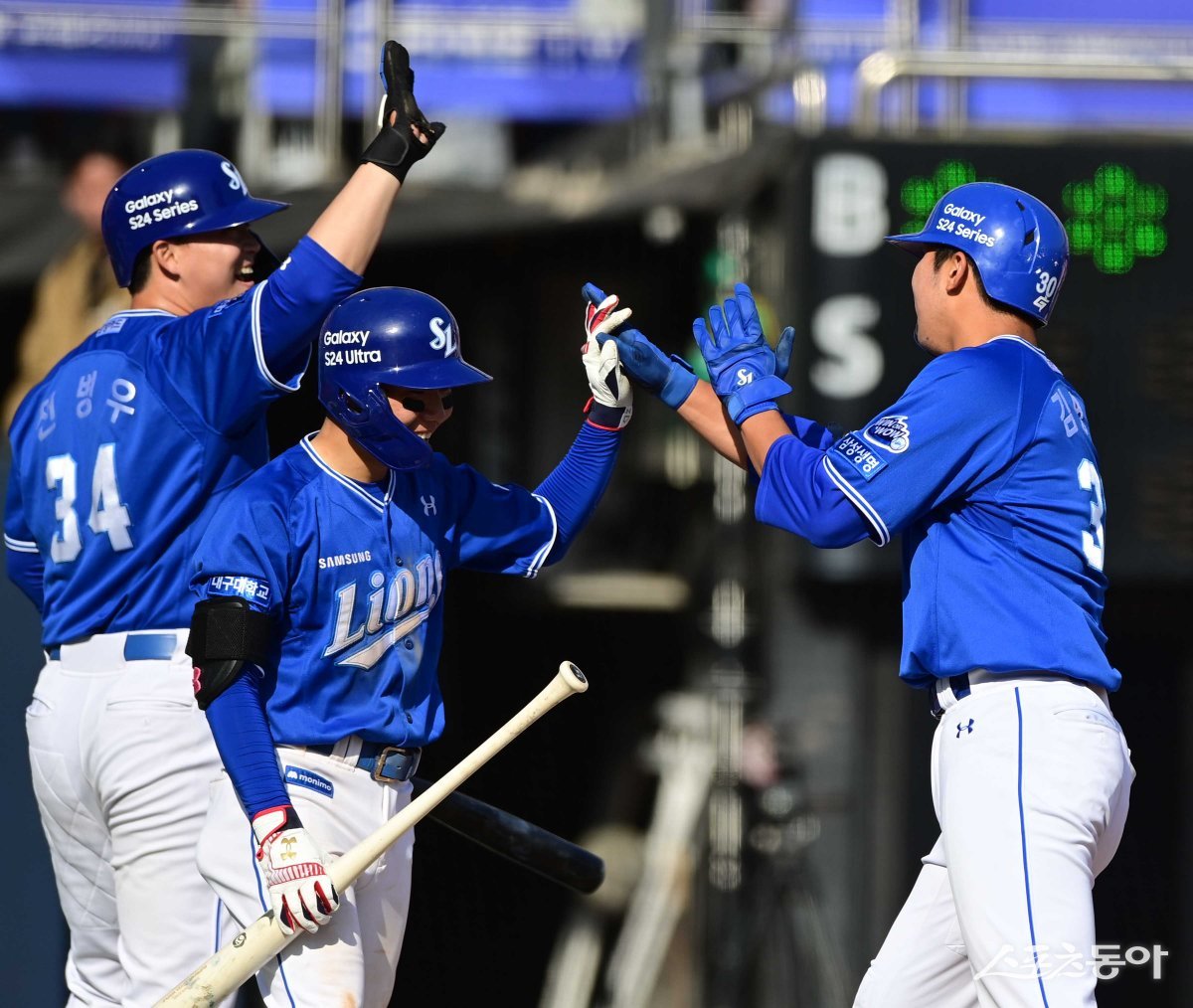 24일 경기도 수원KT위즈파크에서 열린 ‘2024 신한 SOL 뱅크 KBO리그’ KT 위즈와 삼성 라이온즈의 경기에서 7회초 무사 2루 삼성 김영웅이 우월 2점 홈런을 친 후 전병우와 김지찬의 축하를 받고 있다.