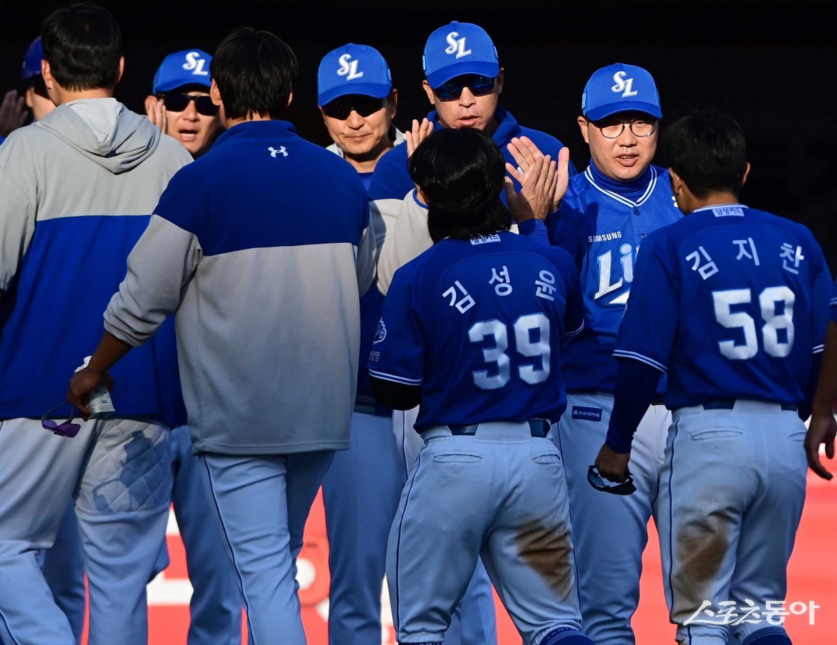 24일 경기도 수원KT위즈파크에서 열린 ‘2024 신한 SOL 뱅크 KBO리그’ KT 위즈와 삼성 라이온즈의 경기에서 11-8로 승리한 삼성 박진만 감독이 선수들과 기쁨을 나누고 있다.