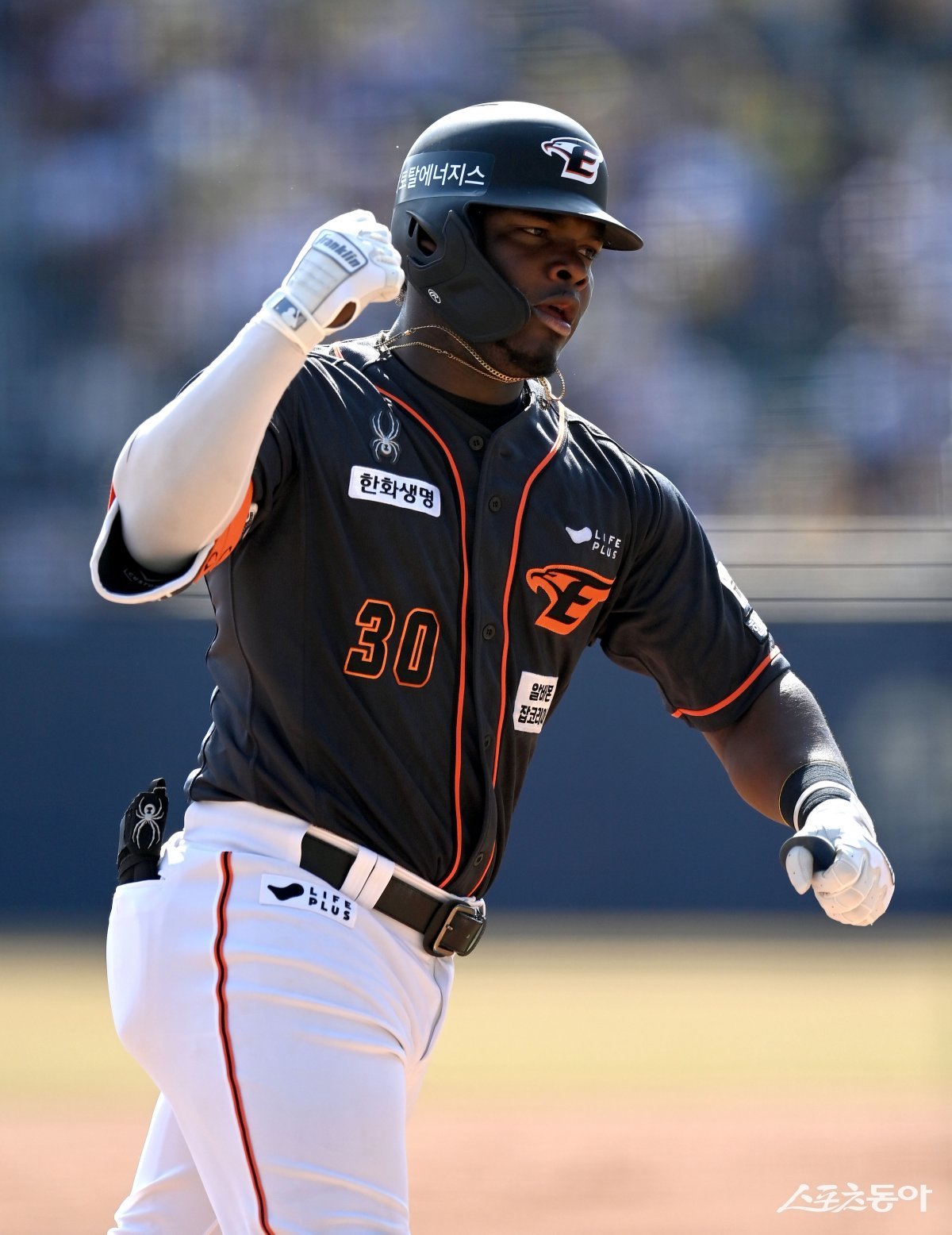 24일 서울 잠실야구장에서 ‘2024 신한은행 SOL뱅크 KBO리그’ 한화 이글스와 LG 트윈스 경기가 열렸다. 4회초 1사 한화 페라자가 동점 우월 솔로 홈런을 날린 후 그라운드를 돌며 기뻐하고 있다.