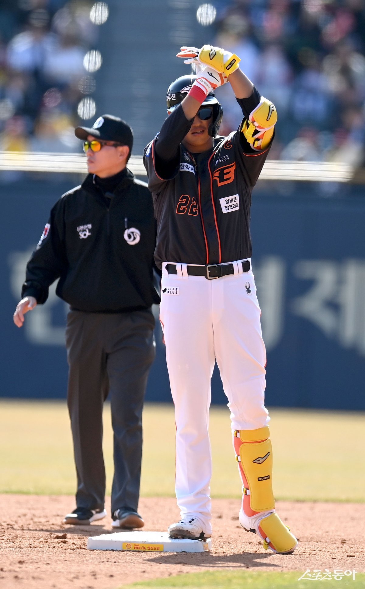 24일 서울 잠실야구장에서 ‘2024 신한은행 SOL뱅크 KBO리그’ 한화 이글스와 LG 트윈스 경기가 열렸다. 5회초 무사 한화 채은성이 좌전 2루타를 치고 2루에서 기뻐하고 있다.