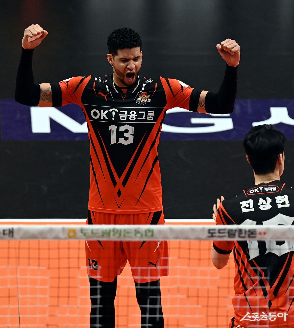 25일 경기도 안산 상록수체육관에서 ‘2023-2024 도드람 V리그’ 안산 OK금융그룹과 서울 우리카드의 남자부 플레이오프 경기가 열렸다. OK금융그룹 레오가 득점을 올린 후 포효하고 있다.