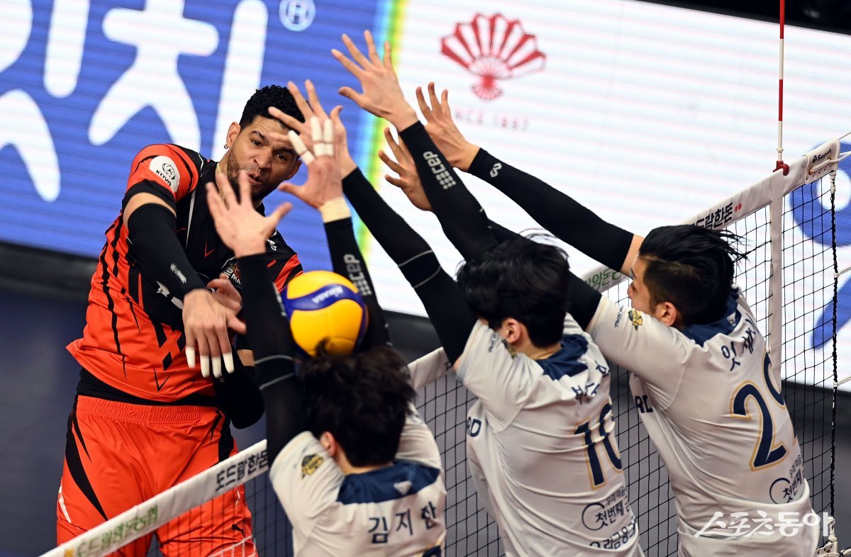 25일 경기도 안산 상록수체육관에서 ‘2023-2024 도드람 V리그’ 안산 OK금융그룹과 서울 우리카드의 남자부 플레이오프 경기가 열렸다. OK금융그룹 레오가 우리카드 블로커를 피해 스파이크를 날리고 있다.