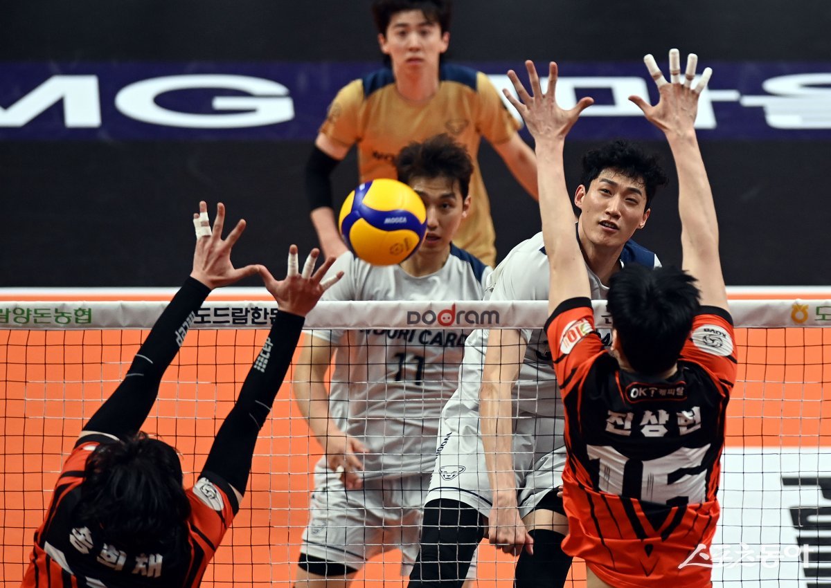 25일 경기도 안산 상록수체육관에서 ‘2023-2024 도드람 V리그’ 안산 OK금융그룹과 서울 우리카드의 남자부 플레이오프 경기가 열렸다. 우리카드 박진우가 OK금웅그룹 블로커를 피해 공격을 펼치고 있다.