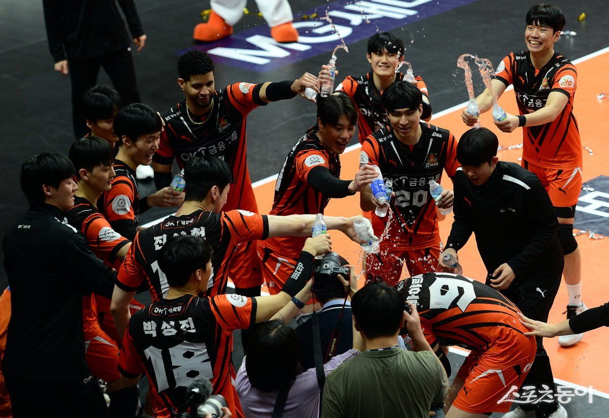 25일 경기도 안산 상록수체육관에서 ‘2023-2024 도드람 V리그’ 안산 OK금융그룹과 서울 우리카드의 남자부 플레이오프 경기가 열렸다. OK금융그룹이 우리카드를 상대로 세트스코어 3-0 승리하며 챔프전 진출 후 선수들이 인터뷰를 마친 바야르사이한을 향해 물 세례를 하고 있다.