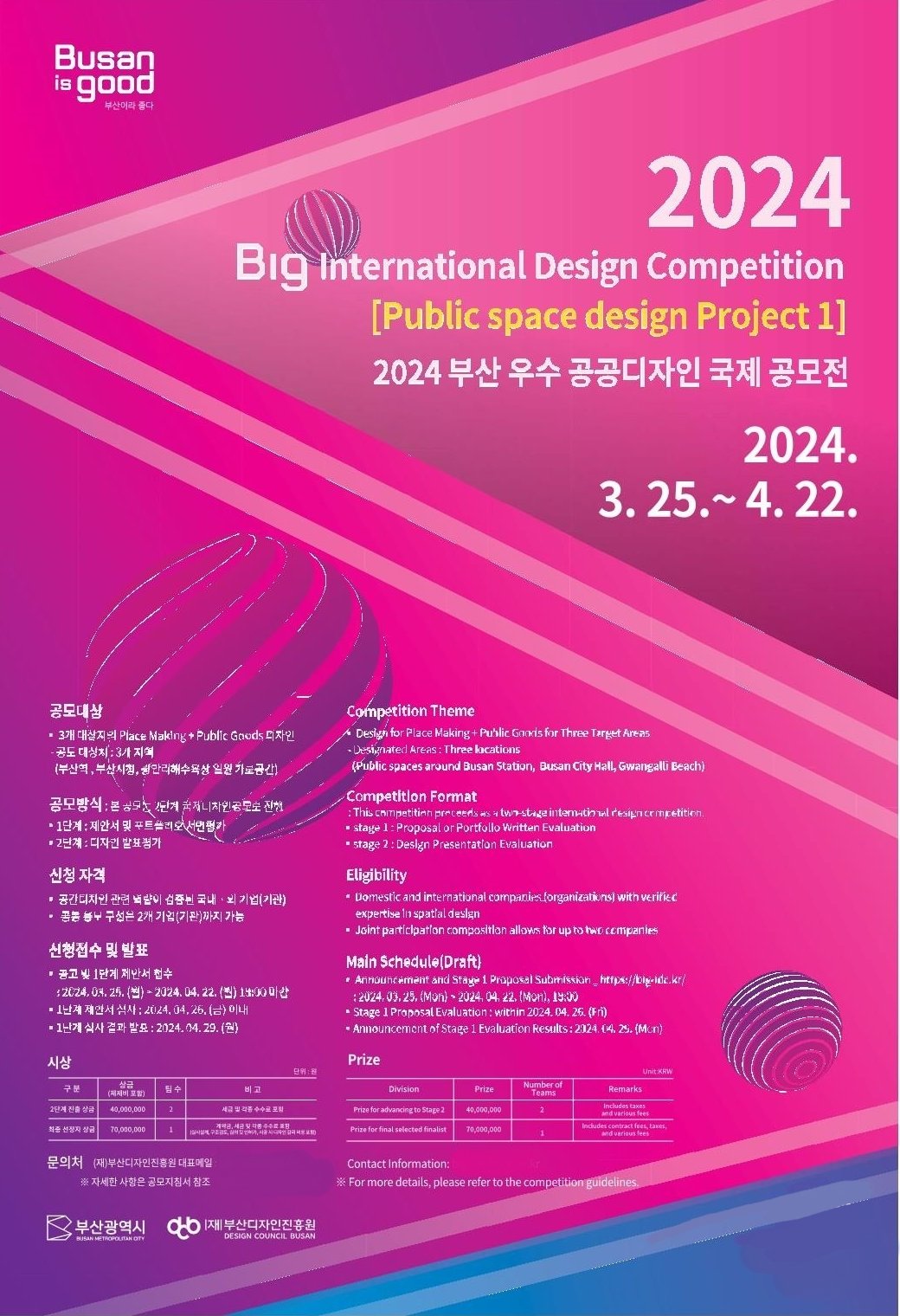 (재)부산디자인진흥원(DCB, 원장 강필현)이 부산시와 ‘2024 부산 우수 공공디자인 국제공모전(Big-Idc)’을 개최한다고 26일 밝혔다.총상금 2억 5000만원 규모
