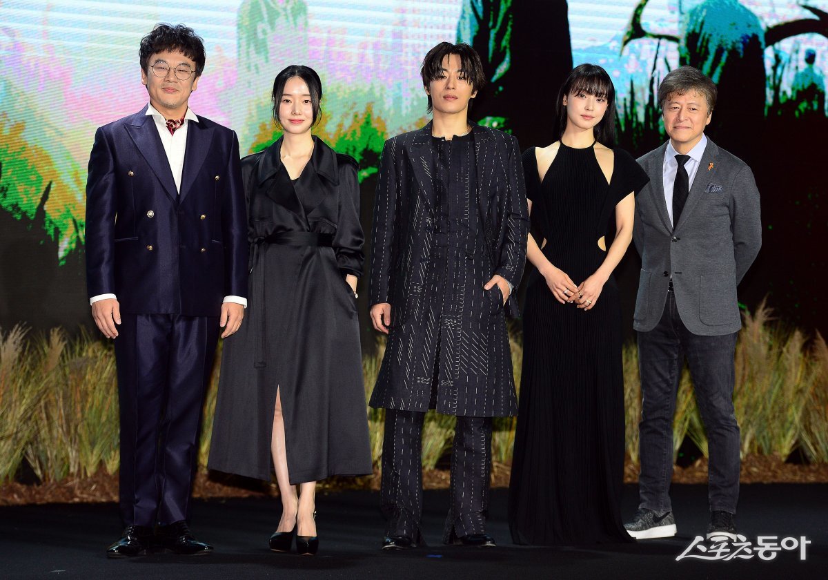 26일 서울 용산구 서울드래곤시티에서 열린 넷플릭스 시리즈 ‘기생수: 더 그레이’ 제작발표회에 참석한 배우 김인권, 이정현, 구교환, 전소니, 권해효가 카메라를 향해 포즈를 취하고 있다.
