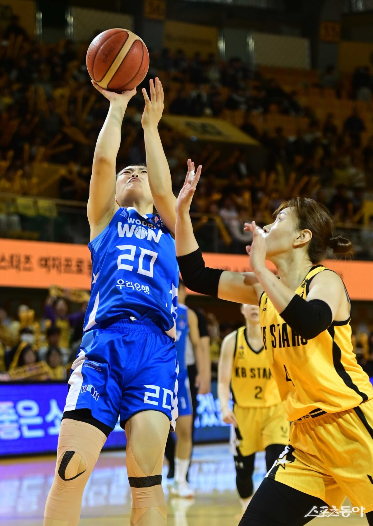 26일 충북 청주체육관에서 열린 ‘우리은행 우리WON 2023-2024 여자프로농구’ 챔피언 결정전 2차전 청주 KB와 아산 우리은행의 경기에서 우리은행 이명관이 슛을 하고 있다.