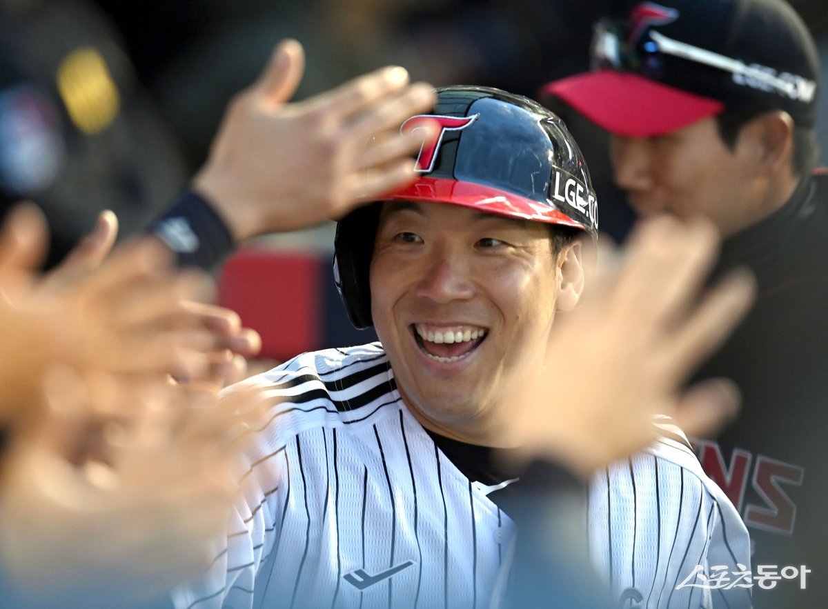 26일 서울 잠실야구장에서 ‘2024 신한은행 SOL뱅크 KBO리그’ 삼성 라이온즈와 LG 트윈스 경기가 열렸다. 1회말 2사 3루 LG 안타 때 득점한 3루주자 김현수가 하이파이브 하고 있다.