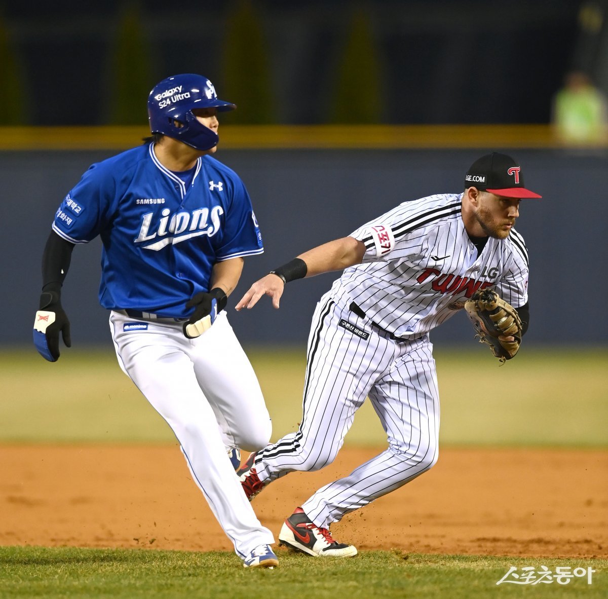 26일 서울 잠실야구장에서 ‘2024 신한은행 SOL뱅크 KBO리그’ 삼성 라이온즈와 LG 트윈스 경기가 열렸다. 2회초 1사 1,2루 삼성 1루수 앞 땅볼 때 LG 오스틴이 1루주자 류지혁을 태그 아웃시키고 있다.