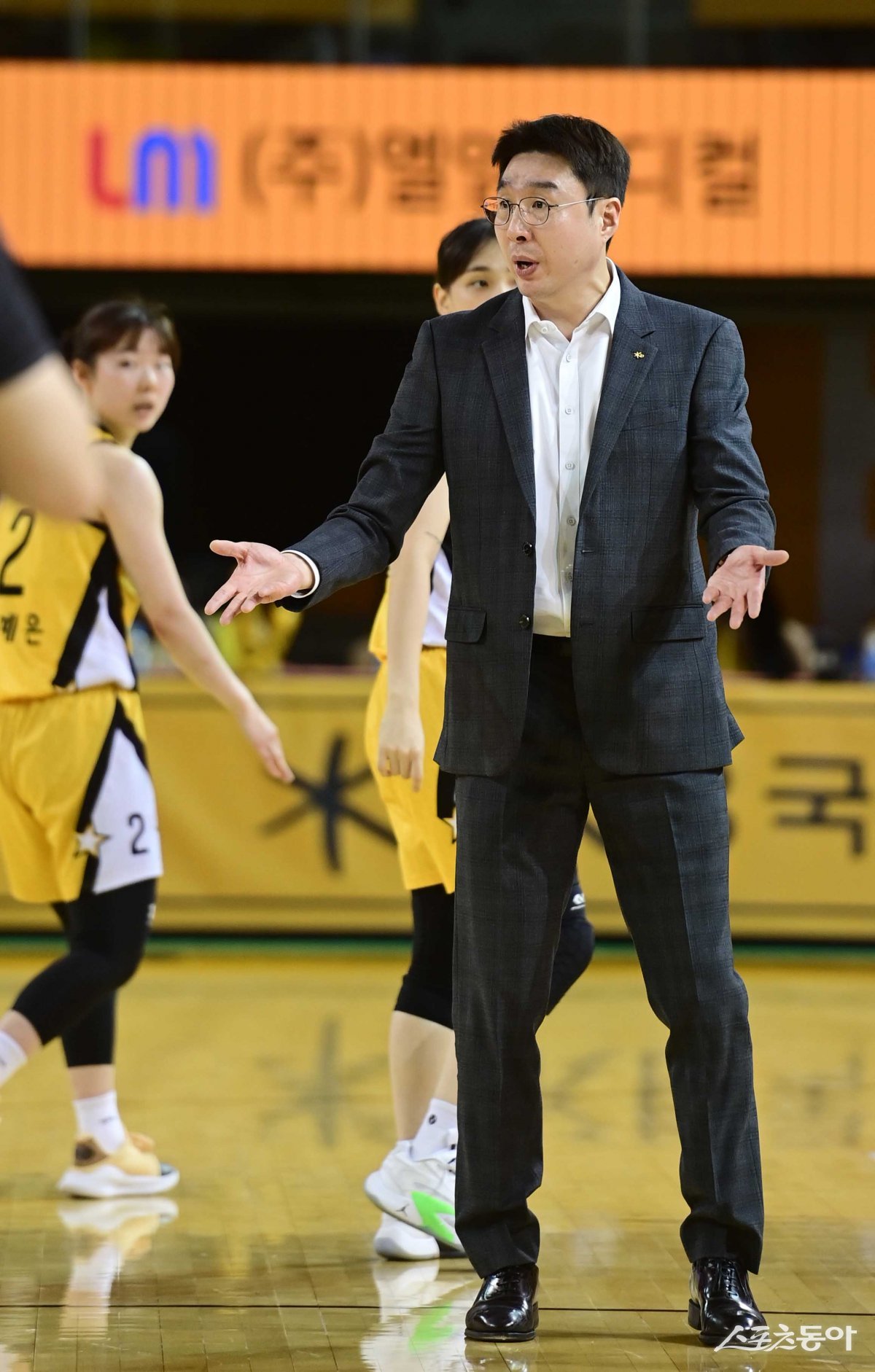 26일 충북 청주체육관에서 열린 ‘우리은행 우리WON 2023-2024 여자프로농구’ 챔피언 결정전 2차전 청주 KB와 아산 우리은행의 경기에서 KB 김완수 감독이 심판 판정에 어필하고 있다.