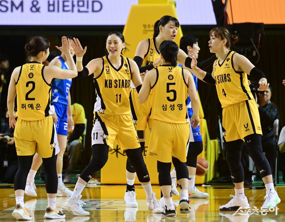 26일 충북 청주체육관에서 열린 ‘우리은행 우리WON 2023-2024 여자프로농구’ 챔피언 결정전 2차전 청주 KB와 아산 우리은행의 경기에서 득점에 성공한 KB 강이슬과 박지수가 동료들과 기쁨을 나누고 있다.