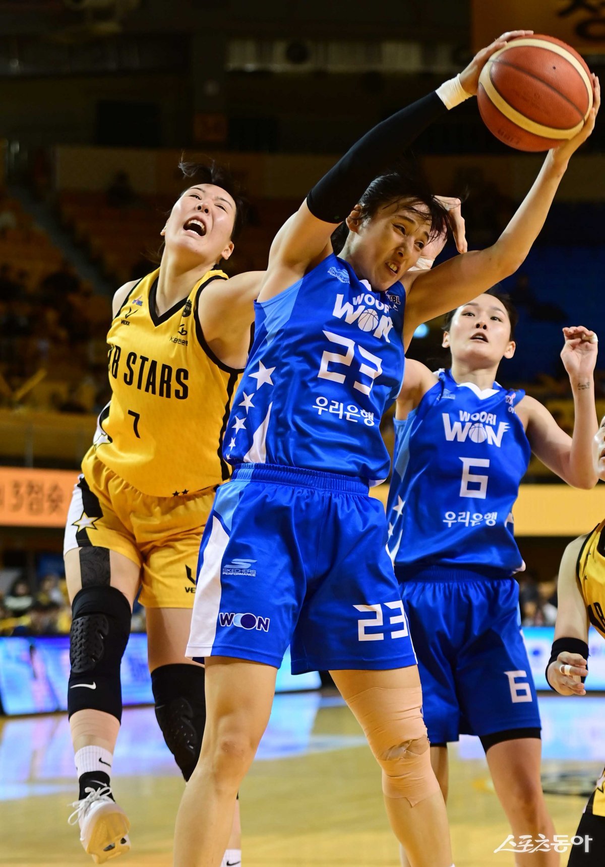 26일 충북 청주체육관에서 열린 ‘우리은행 우리WON 2023-2024 여자프로농구’ 챔피언 결정전 2차전 청주 KB와 아산 우리은행의 경기에서 우리은행 김단비가 KB 박지수 앞에서 리바운드된 볼을 잡고 있다.