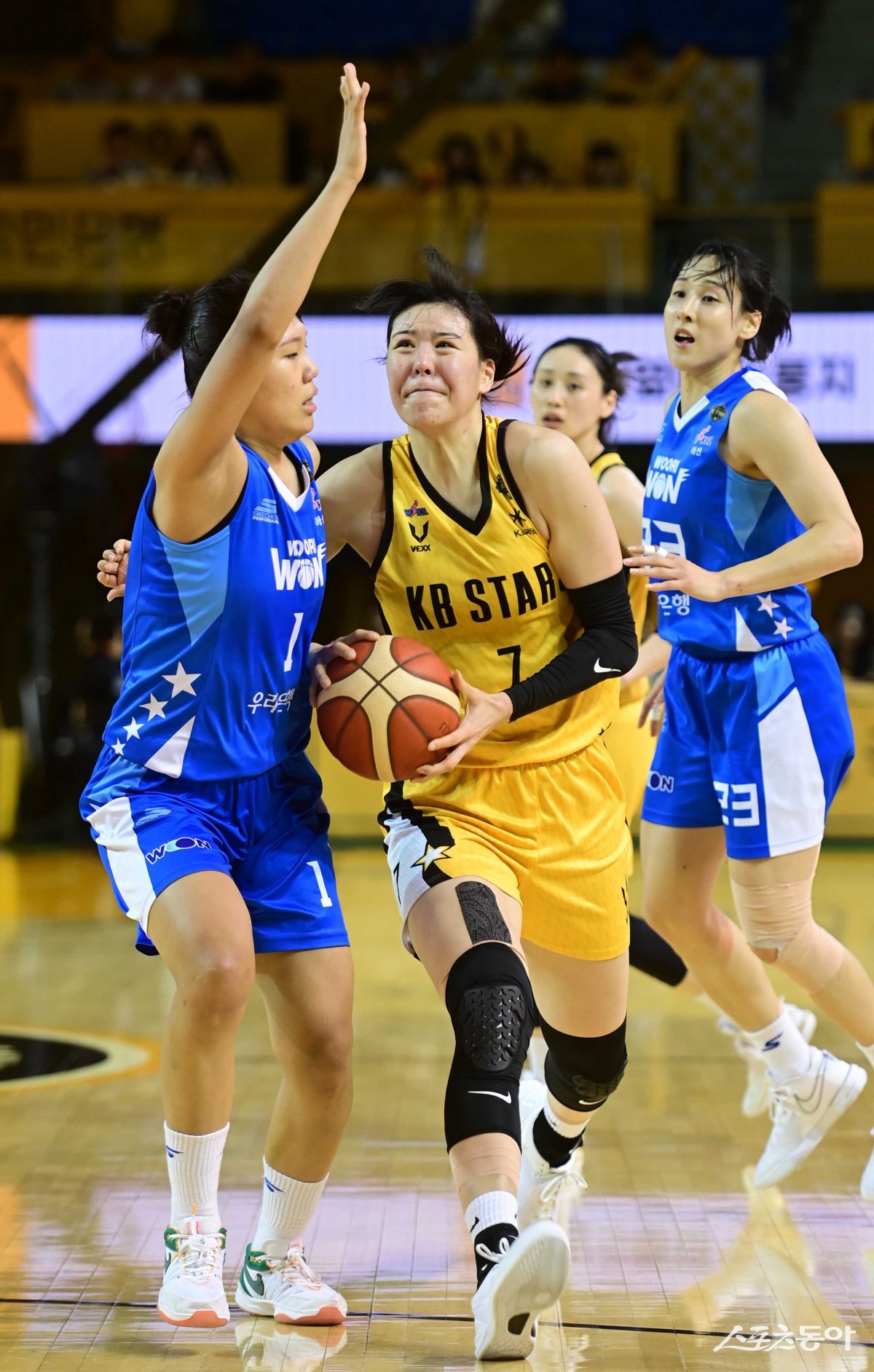 26일 충북 청주체육관에서 열린 ‘우리은행 우리WON 2023-2024 여자프로농구’ 챔피언 결정전 2차전 청주 KB와 아산 우리은행의 경기에서 KB 박지수가 우리은행 박지현의 수비를 뚫고 드리블 돌파를 하고 있다.