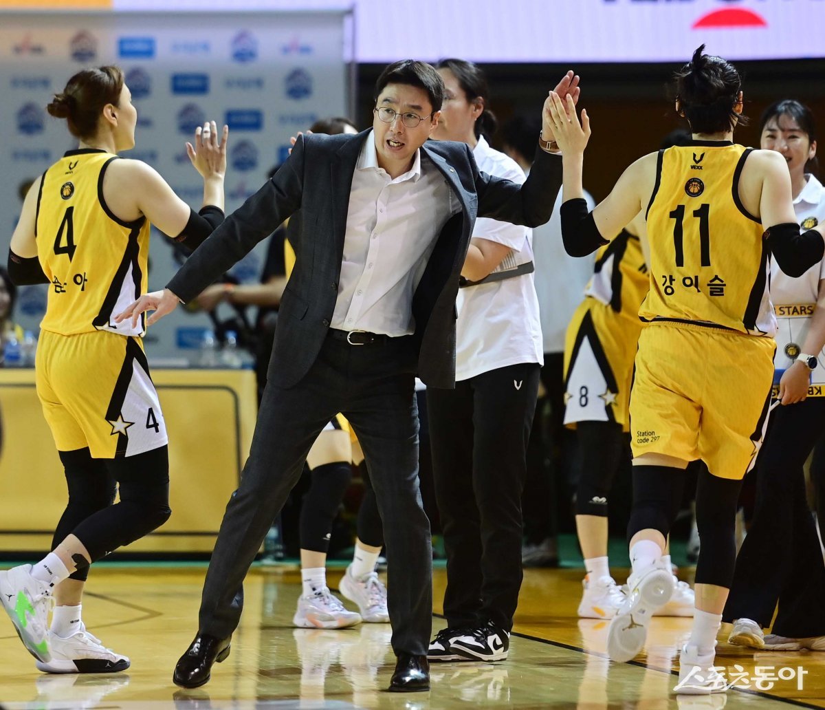 26일 충북 청주체육관에서 열린 ‘우리은행 우리WON 2023-2024 여자프로농구’ 챔피언 결정전 2차전 청주 KB와 아산 우리은행의 경기에서 KB 김완수 감독이 득점에 성공한 선수들과 기쁨을 나누고 있다.