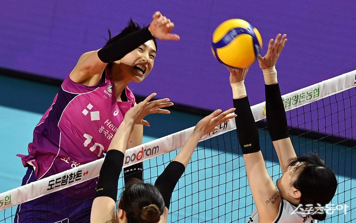 흥국생명 김연경이 정관장 블로커를 피해 스파이크를 날리고 있다. 인천 | 김민성 기자 marineboy@donga.com