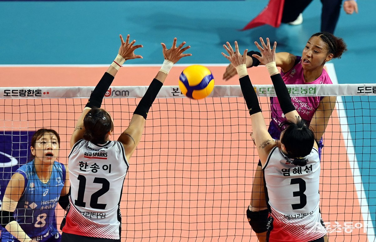 26일 인천 삼산월드체육관에서 ‘2023-2024 도드람 V리그’ 인천 흥국생명과 대전 정관장의 여자부 플레이오프 경기가 열렸다. 흥국생명 레이나가 정관장 블로커를 피해 스파이크를 날리고 있다.