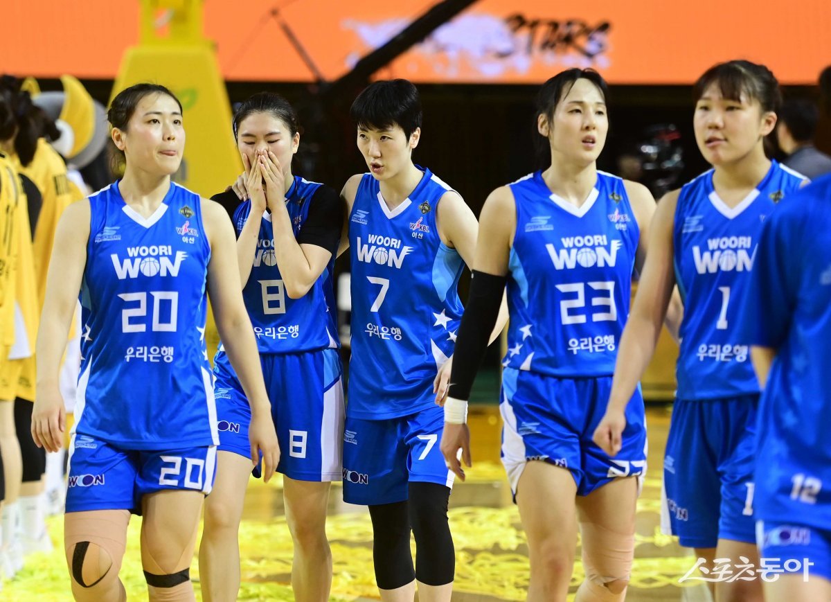 26일 충북 청주체육관에서 열린 ‘우리은행 우리WON 2023-2024 여자프로농구’ 챔피언 결정전 2차전 청주 KB와 아산 우리은행의 경기에서 60-64로 패한 우리은행 선수들이 아쉬워하고 있다.