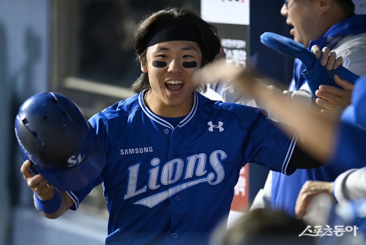 26일 서울 잠실야구장에서 ‘2024 신한은행 SOL뱅크 KBO리그’ 삼성 라이온즈와 LG 트윈스 경기가 열렸다. 6회초 2사 2,3루 삼성 안타 때 득점한 김성윤이 기뻐하고 있다.