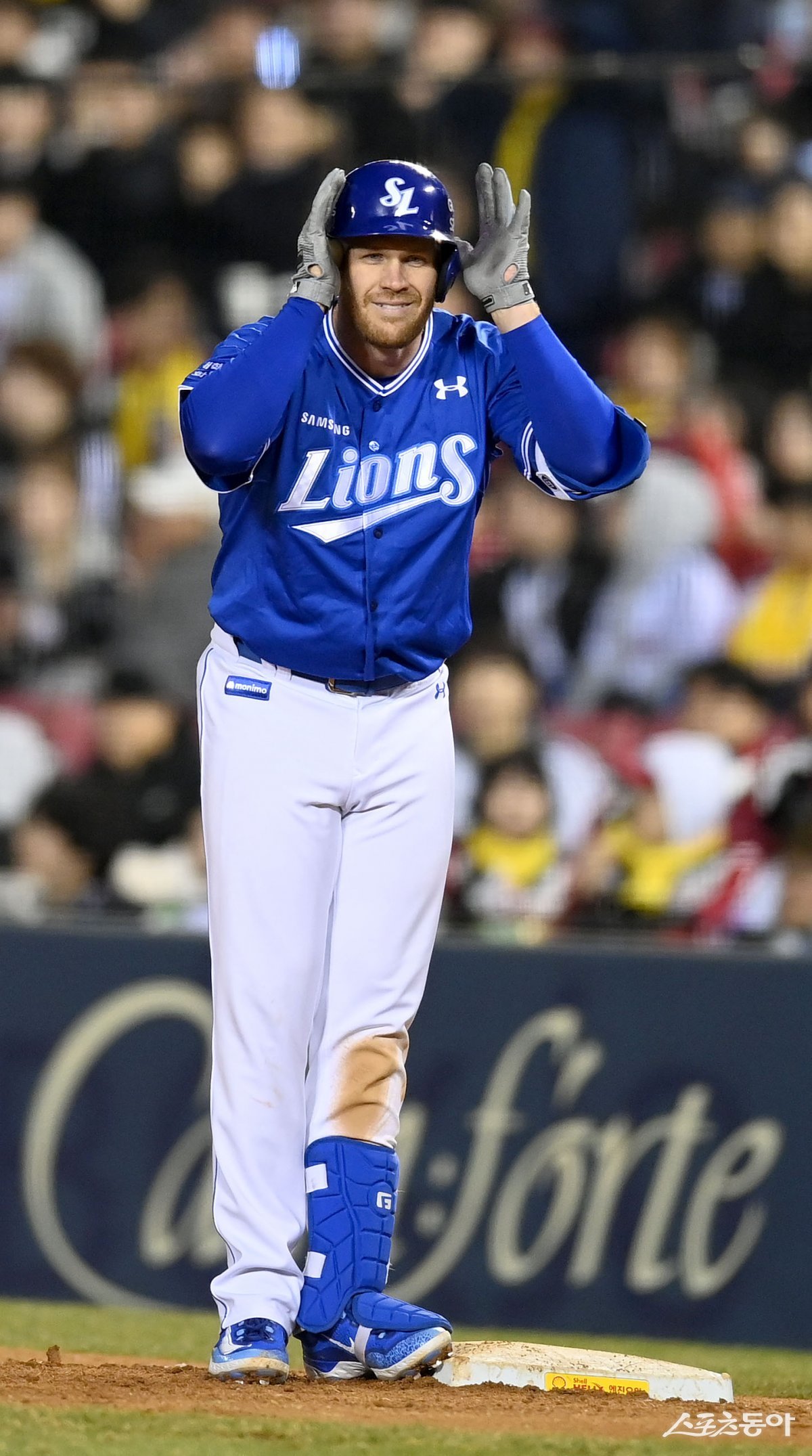 26일 서울 잠실야구장에서 ‘2024 신한은행 SOL뱅크 KBO리그’ 삼성 라이온즈와 LG 트윈스 경기가 열렸다. 6회초 2사 2,3루 삼성 맥키넌이 2타점 동점 적시타를 치고 1루에서 기뻐하고 있다.