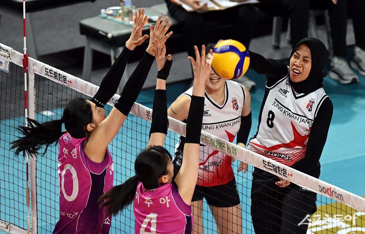 26일 인천 삼산월드체육관에서 ‘2023-2024 도드람 V리그’ 인천 흥국생명과 대전 정관장의 여자부 플레이오프 경기가 열렸다. 정관장 메가가 흥국생명 블로커를 피해 스파이크를 날리고 있다.