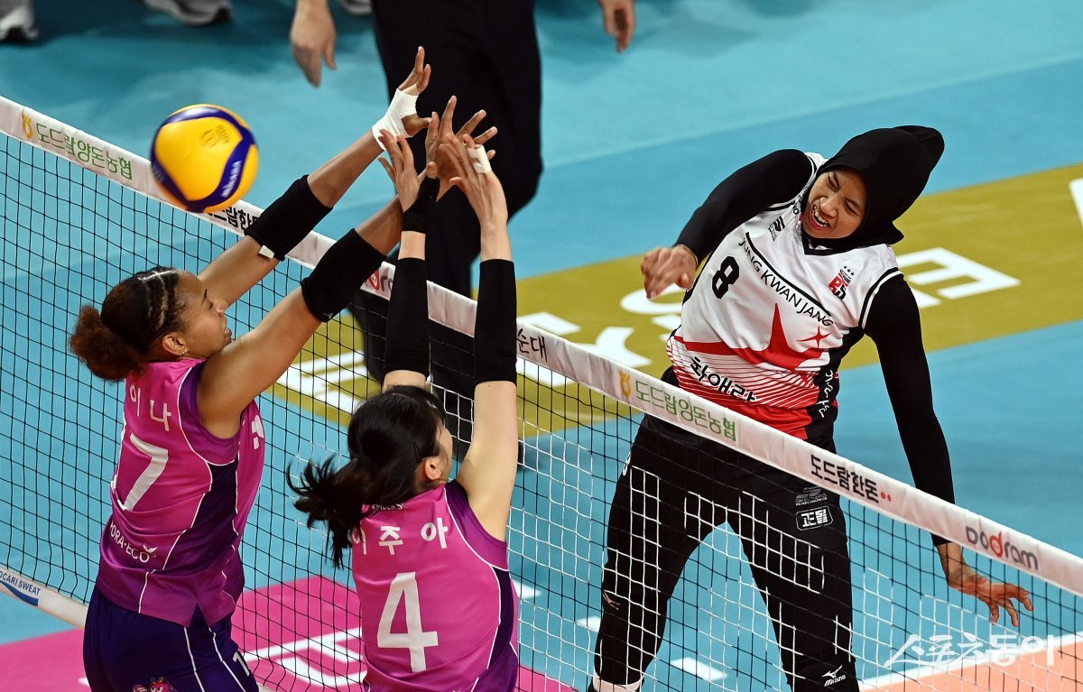 26일 인천 삼산월드체육관에서 ‘2023-2024 도드람 V리그’ 인천 흥국생명과 대전 정관장의 여자부 플레이오프 경기가 열렸다. 정관장 메가가 흥국생명 블로커를 피해 스파이크를 날리고 있다.