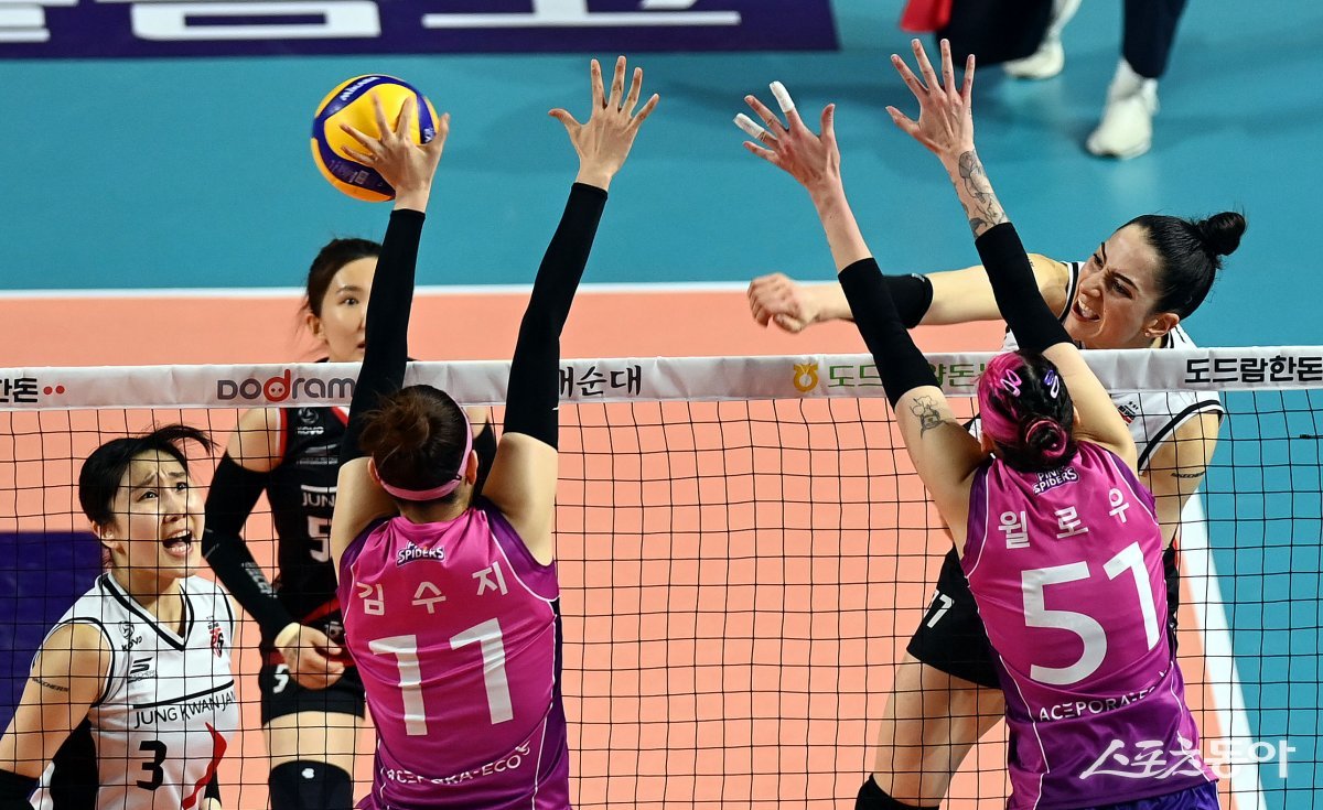 26일 인천 삼산월드체육관에서 ‘2023-2024 도드람 V리그’ 인천 흥국생명과 대전 정관장의 여자부 플레이오프 경기가 열렸다. 정관장 지아가 흥국생명 블로커를 피해 스파이크를 날리고 있다.