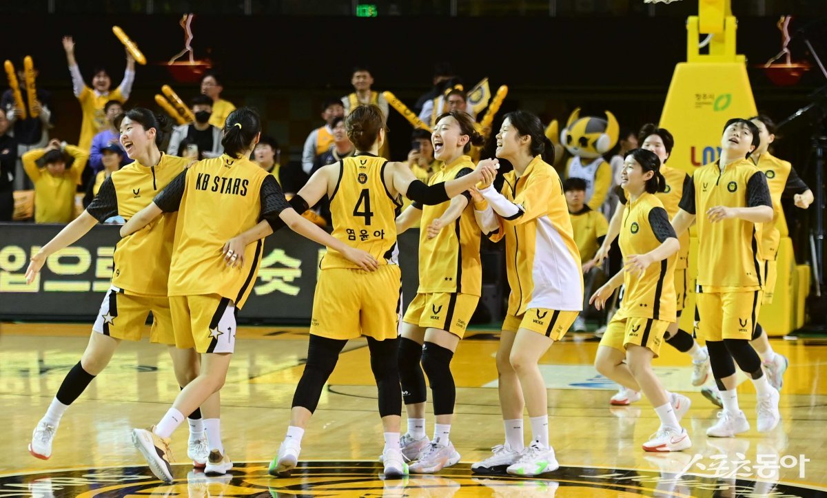 26일 충북 청주체육관에서 열린 ‘우리은행 우리WON 2023-2024 여자프로농구’ 챔피언 결정전 2차전 청주 KB와 아산 우리은행의 경기에서 64-60으로 승리한 KB 선수들이 기쁨을 나누고 있다.