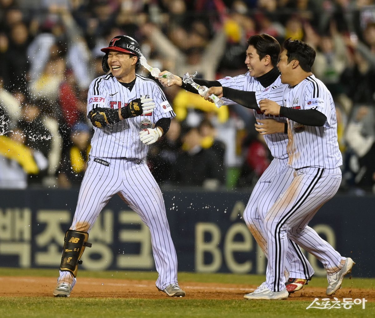 26일 서울 잠실야구장에서 ‘2024 신한은행 SOL뱅크 KBO리그’ 삼성 라이온즈와 LG 트윈스 경기가 열렸다. 9회말 1사 3루 LG 문성주가 끝내기 희생타를 친 후 기뻐하고 있다.