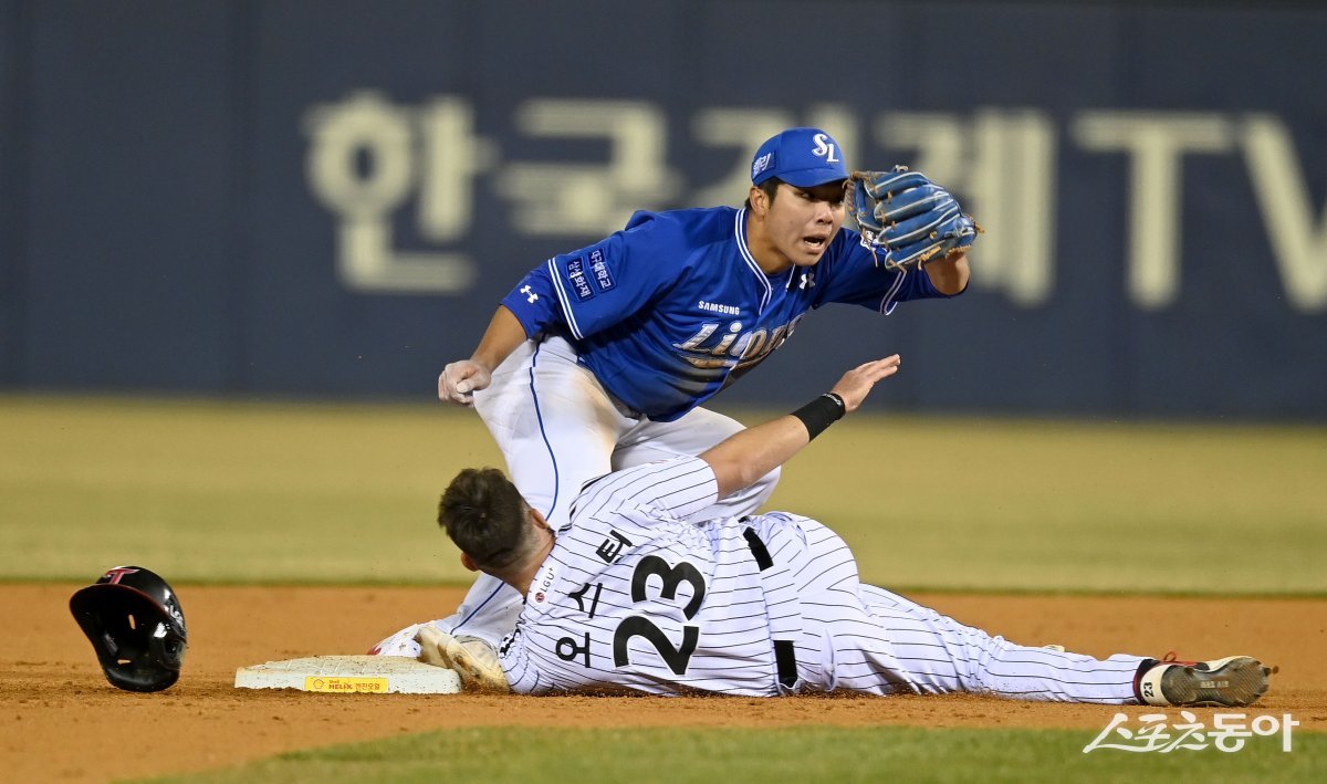 26일 서울 잠실야구장에서 ‘2024 신한은행 SOL뱅크 KBO리그’ 삼성 라이온즈와 LG 트윈스 경기가 열렸다. 6회말 1사 1루 LG 타자가 외야 뜬공으로 아웃된 후 1루로 송구된 볼이 빠지자 1루주자 오스틴이 2루까지 달렸으나 아웃되고 있다.