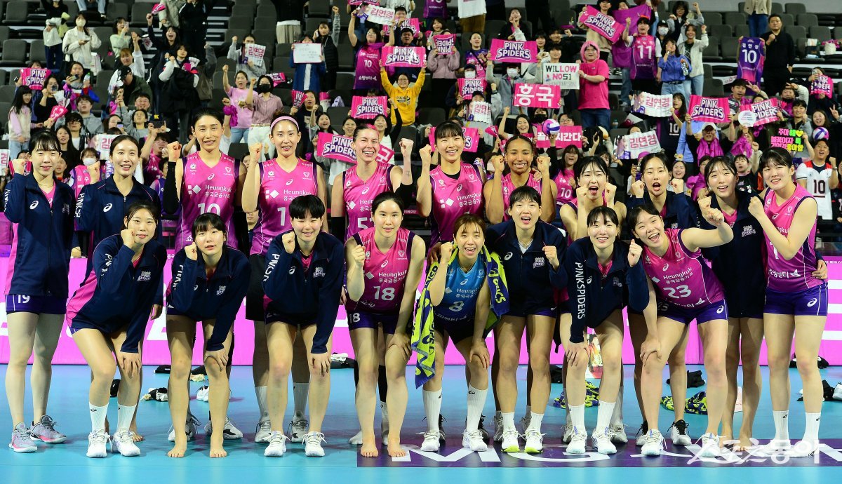 26일 인천 삼산월드체육관에서 ‘2023-2024 도드람 V리그’ 인천 흥국생명과 대전 정관장의 여자부 플레이오프 경기가 열렸다. 흥국생명이 정관장을 상대로 세트스코어 3-0 승리하며 챔프전 진출에 성공한 후 선수들이 기념촬영을 하고 있다.