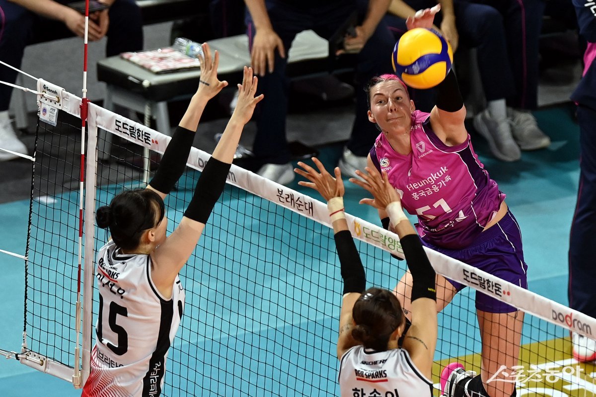 26일 인천 삼산월드체육관에서 ‘2023-2024 도드람 V리그’ 인천 흥국생명과 대전 정관장의 여자부 플레이오프 경기가 열렸다. 흥국생명 윌로우가 정관장 블로커를 피해 스파이크를 날리고 있다.