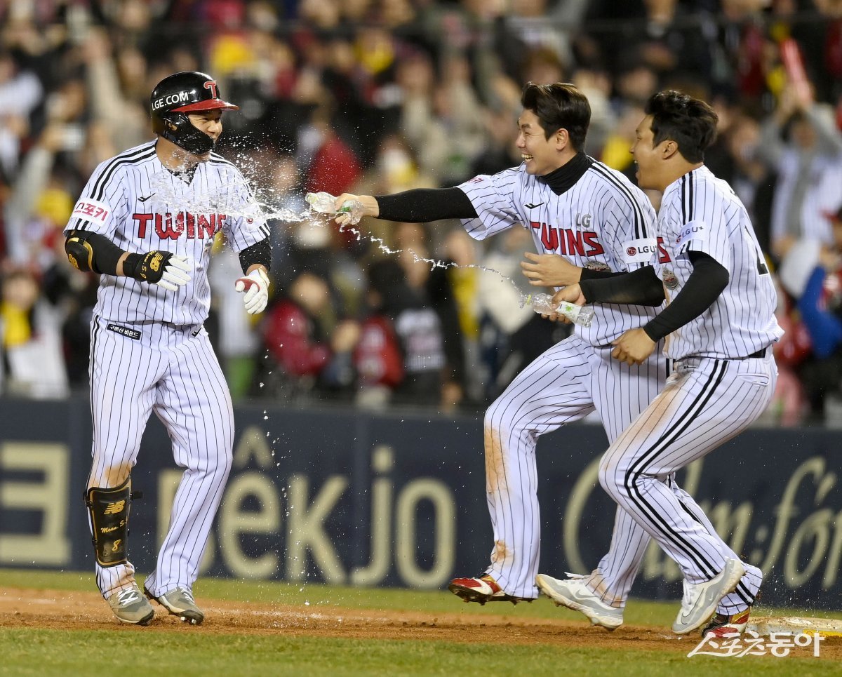 26일 서울 잠실야구장에서 ‘2024 신한은행 SOL뱅크 KBO리그’ 삼성 라이온즈와 LG 트윈스 경기가 열렸다. 9회말 1사 3루 LG 문성주가 끝내기 희생타를 친 후 기뻐하고 있다.