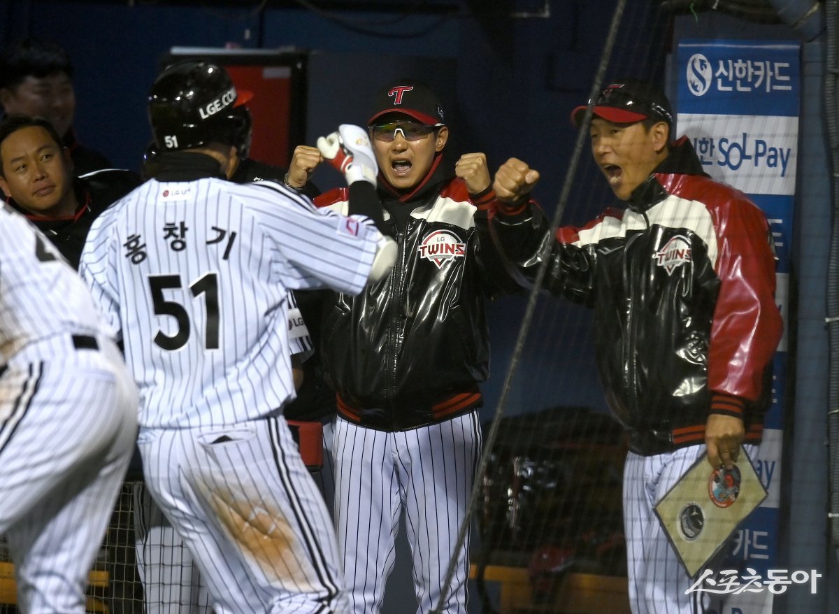 26일 서울 잠실야구장에서 ‘2024 신한은행 SOL뱅크 KBO리그’ 삼성 라이온즈와 LG 트윈스 경기가 열렸다. 8회말 무사 LG 홍창기가 우월 동점 솔로 홈런을 날린 후 그라운드를 돌아 홈인해 염경엽 감독과 기뻐하고 있다.