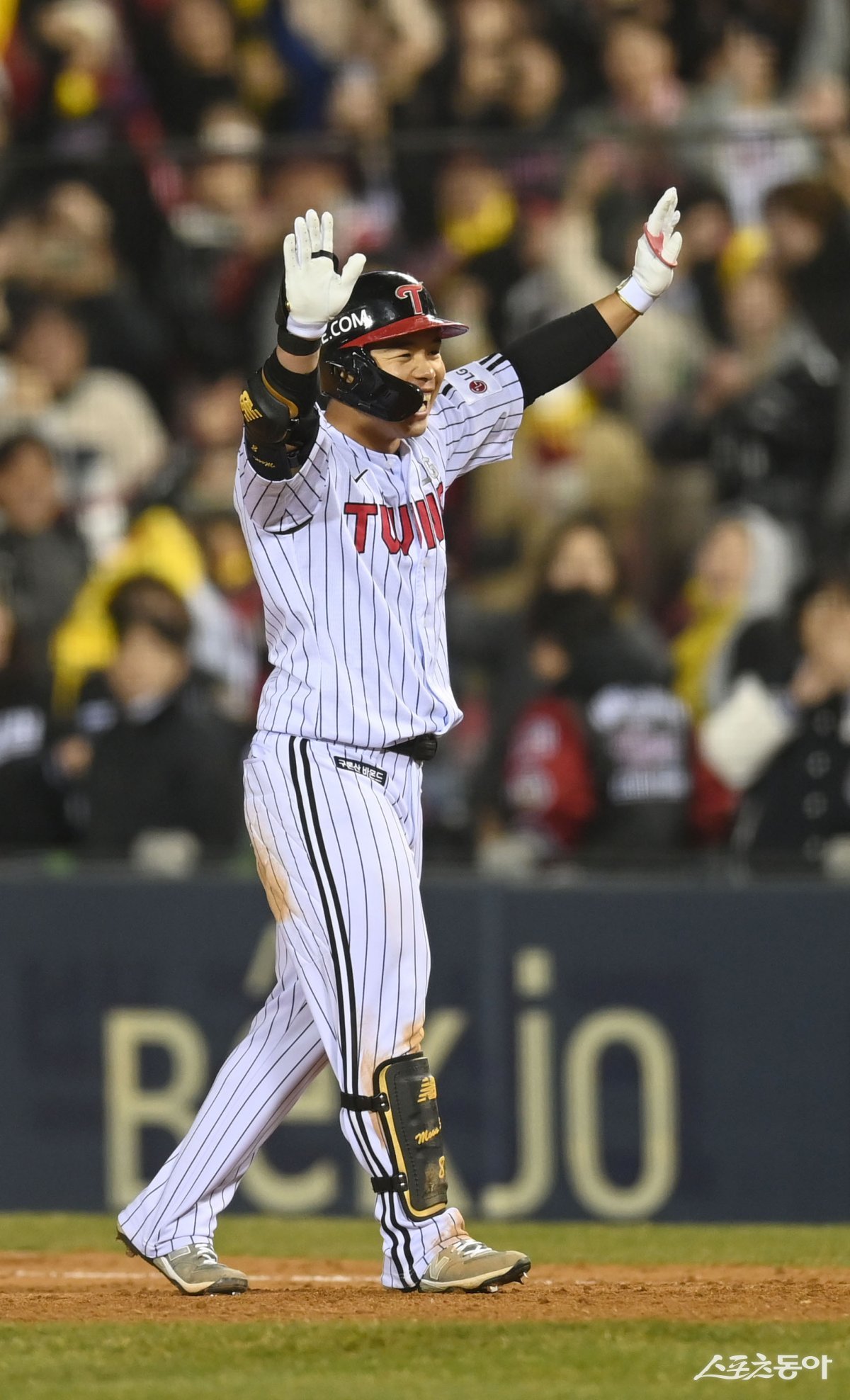 26일 서울 잠실야구장에서 ‘2024 신한은행 SOL뱅크 KBO리그’ 삼성 라이온즈와 LG 트윈스 경기가 열렸다. 9회말 1사 3루 LG 문성주가 끝내기 희생타를 친 후 기뻐하고 있다.