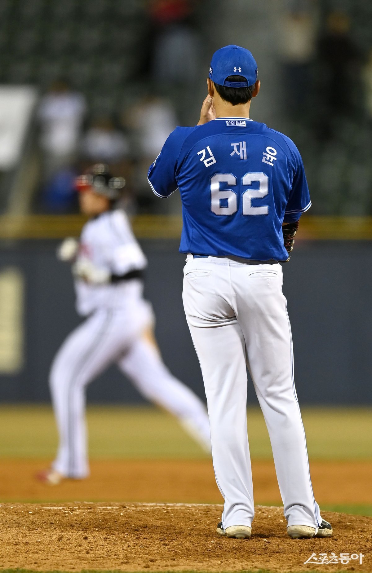 26일 서울 잠실야구장에서 ‘2024 신한은행 SOL뱅크 KBO리그’ 삼성 라이온즈와 LG 트윈스 경기가 열렸다. 삼성 김재윤이 8회말 무사 LG 홍창기에게 우월 동점 솔로 홈런을 허용하고 있다.