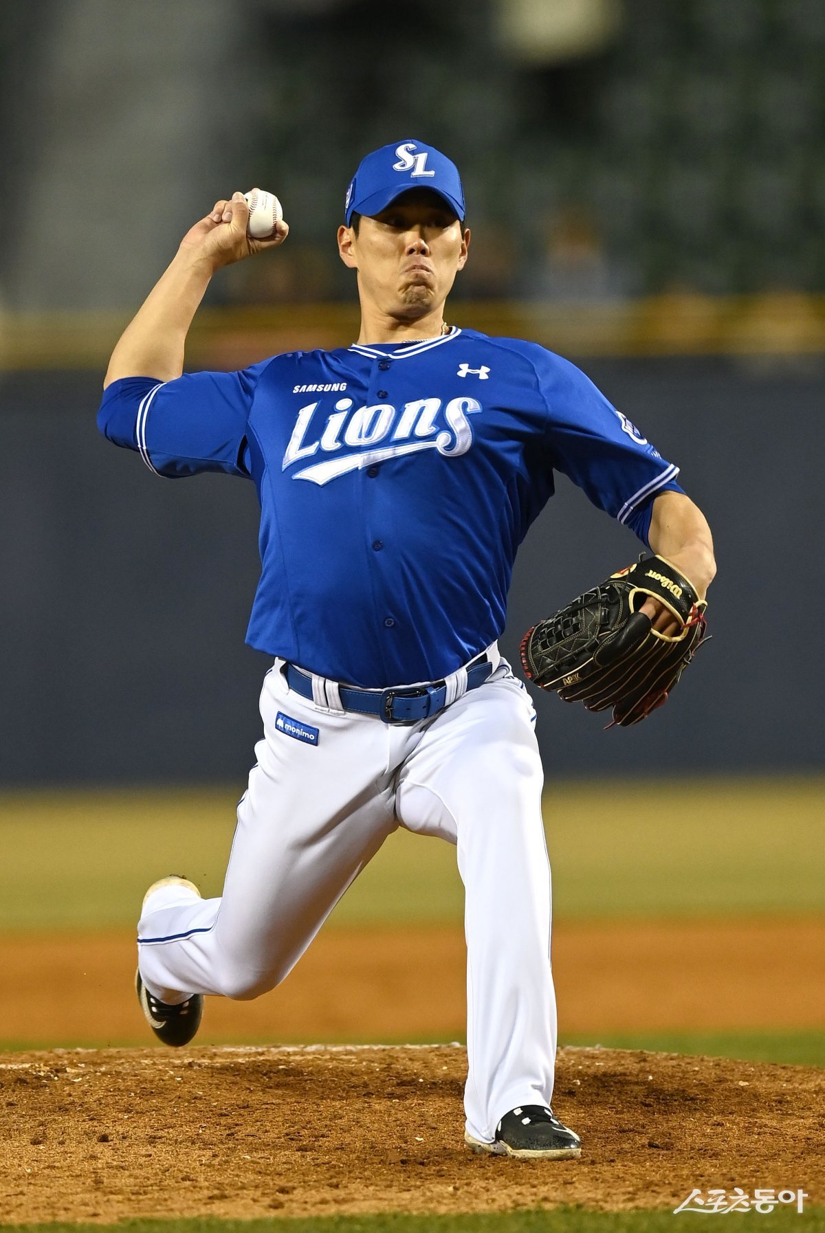 26일 서울 잠실야구장에서 ‘2024 신한은행 SOL뱅크 KBO리그’ 삼성 라이온즈와 LG 트윈스 경기가 열렸다. 교체 등판한 삼성 김재윤이 역투하고 있다.