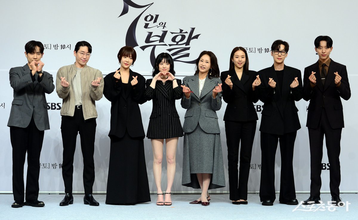 27일 서울 양천구 목동 SBS 사옥에서 열린 SBS 새 금토드라마 ‘7인의 부활’ 제작발표회에 참석한 이준, 엄기준, 황정음, 이유비, 신은경, 조윤희, 윤종훈, 이정신이 카메라를 향해 포즈를 취하고 있다.