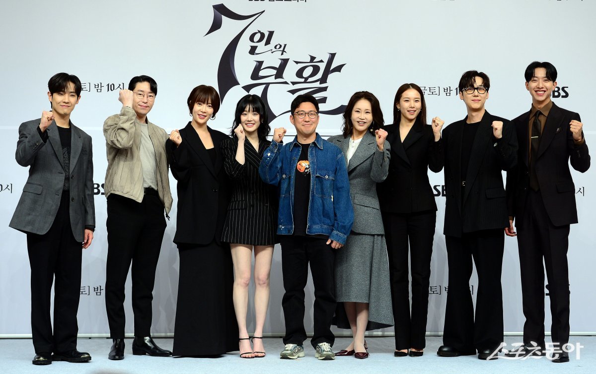 27일 서울 양천구 목동 SBS 사옥에서 열린 SBS 새 금토드라마 ‘7인의 부활’ 제작발표회에 참석한 이준, 엄기준, 황정음, 이유비, 오준혁 감독, 신은경, 조윤희, 윤종훈, 이정신이 카메라를 향해 포즈를 취하고 있다.