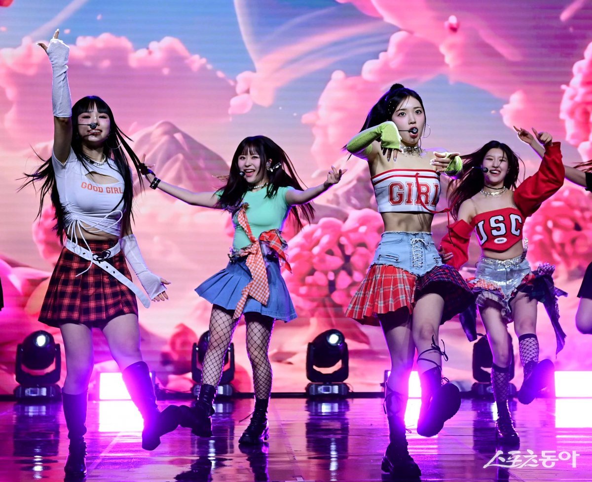 그룹 캔디샵이 27일 서울 강남구 청담동 일지아트홀에서 열린 미니앨범 1집 ‘Hashtag#(해시태그#)’ 발매 프레스 쇼케이스에서 타이틀곡 ‘Good Girl(굿 걸)’ 무대를 펼치고 있다.