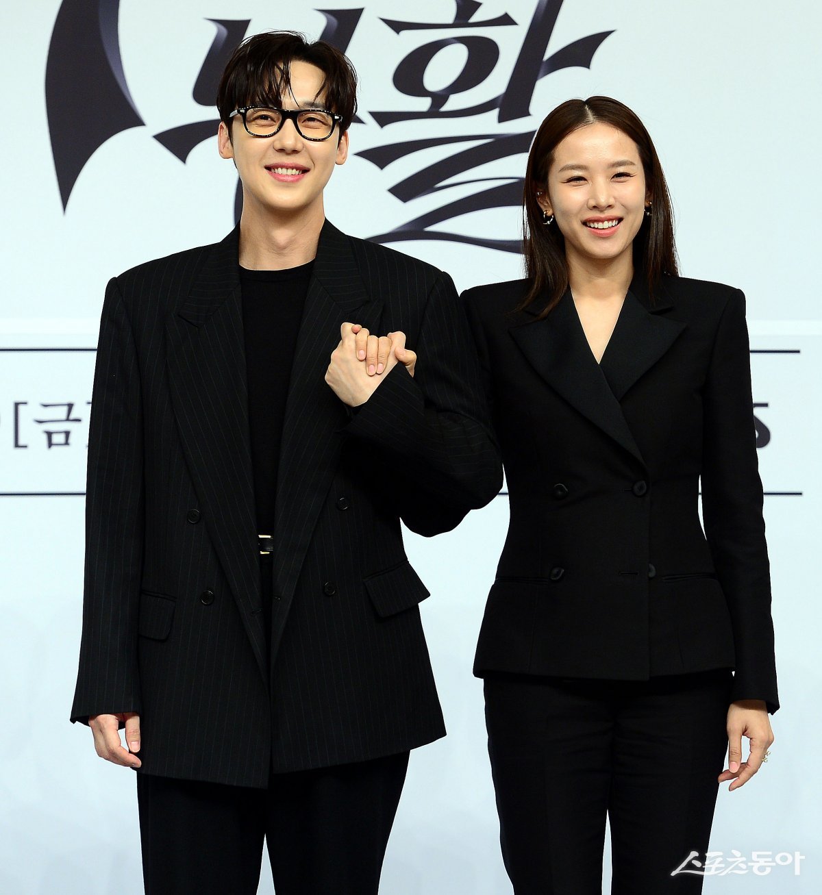 27일 서울 양천구 목동 SBS 사옥에서 열린 SBS 새 금토드라마 ‘7인의 부활’ 제작발표회에 참석한 윤종훈, 조윤희가 카메라를 향해 포즈를 취하고 있다.